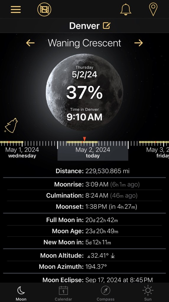 Today’s moon is a waning crescent, at 37% illumination. May 7th is the next new moon, and we still have a week left in the Mercury Retrograde Shadow.
