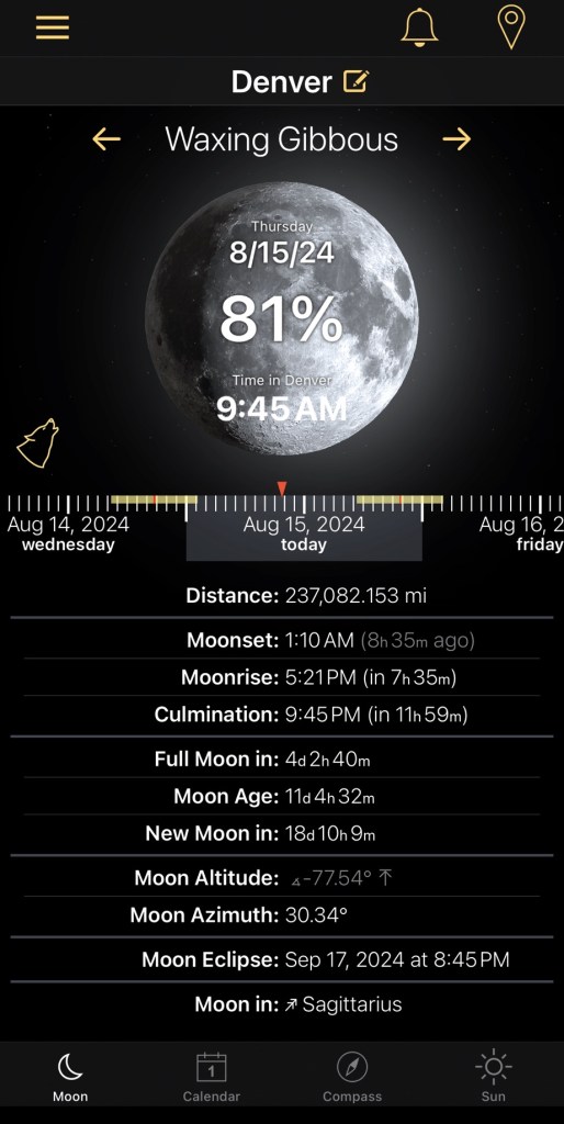 Luna is at 81% illumination, sitting in Sagittarius with about four days left before our next full moon. This is considered a blue moon because it will be full a week before it should be. That is fascinating, isn’t it?