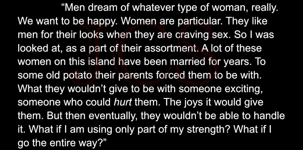 Miguel Cervantez reminds his wife, Nia, why he doesn’t mingle with humans…and the entire passage is everything. I laughed out loud, then of course, showed my significant other!