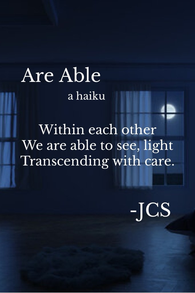 Blog, Haiku, Poetry Are Able – Haiku Posted by TheHeiressJCS on February 17, 2025 Share this: Click to share on X (Opens in new window) X Click to share on Facebook (Opens in new window) Facebook Click to share on Bluesky (Opens in new window) Bluesky Like Loading...